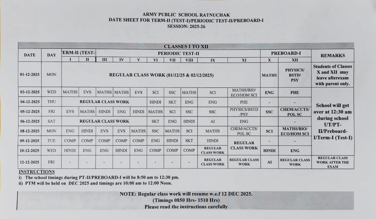 Datesheet for Term-II(Test-I)/PT-II/Preboard-2025