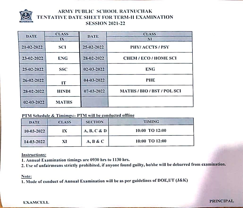 Date Sheet for Class IX & XI of Term-II Examination:2021-22